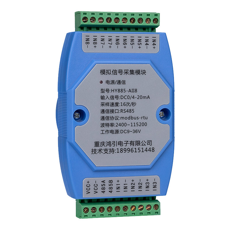 采用進口16位模數轉換芯片,把8路DC0~20mA模擬信號轉換成數字信號,通過RS485接口輸出,DC0~20mA輸入對應的數字量為0-20000,最高可測到DC24mA。DC0~20mA模擬信號輸入與工作電源、RS485之間隔離。RS485通信采用標準Modbus-rtu協議,可與各種組態(tài)軟件、PLC、觸摸屏聯網。出廠預設RS485通信參數:模塊地址1,波特率9600,8個數據位,無校驗位,1位停止位,用戶通過上位機參數設置軟件修改通信參數。