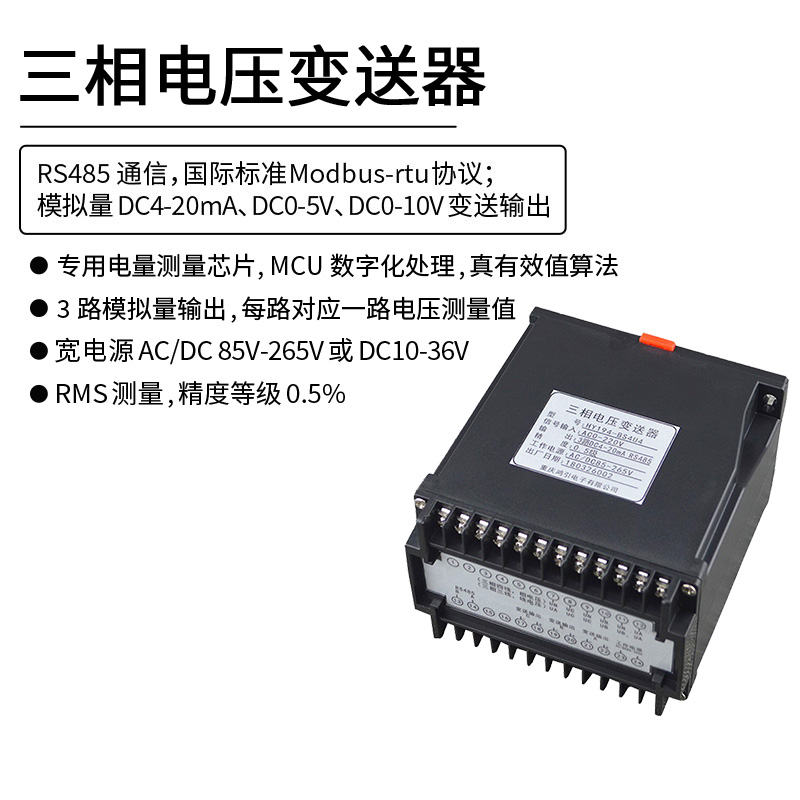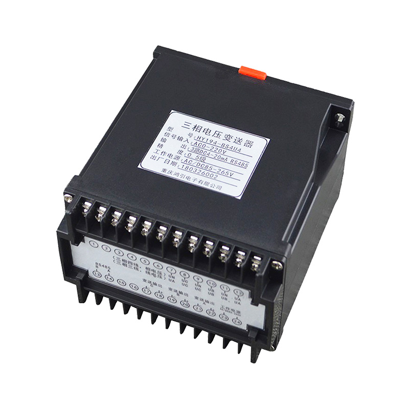 三相電壓變送器,通過(guò)專用電量芯片采樣,CPU 數(shù)字化處理,真有效值算法,高精度的測(cè)量三相電壓,隔離轉(zhuǎn)換成線性直流標(biāo)準(zhǔn)模擬信號(hào)輸出或RS485數(shù)字通信接口輸出。模擬量可選:DC0~20mA、DC4~20mA、DC0~5V、DC1~5V、DC0~10V等變送輸出;RS485數(shù)字通信接口,采用國(guó)際標(biāo)準(zhǔn)Modbus-rtu通信協(xié)議,可與各種PLC、HMI、組態(tài)軟件實(shí)現(xiàn)組網(wǎng)。