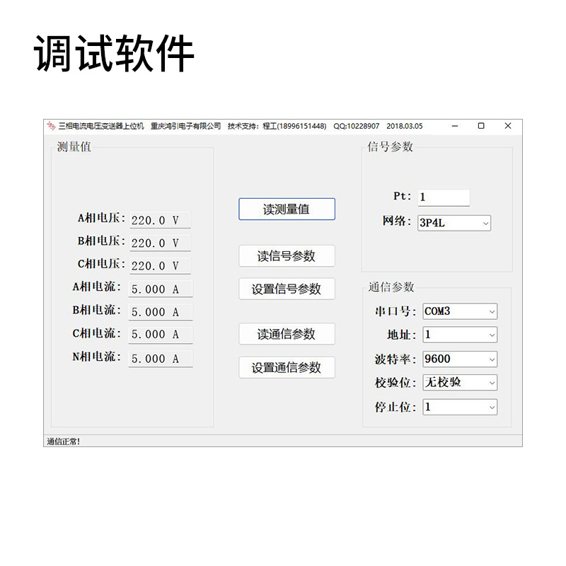 通過(guò)上位機(jī)調(diào)試軟件,可以讀出三相電壓測(cè)量值;可以設(shè)置電壓變比,接線方式;可以設(shè)置電壓變送器的通信地址,波特率,數(shù)據(jù)格式等。上位機(jī)調(diào)試軟件界面: