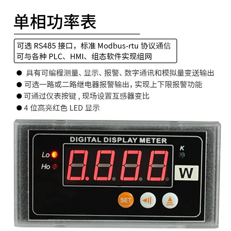 HY194系列數顯單相交流功率表,是一種具有可編程測量、顯示、報警、數字通訊和模擬量變送輸出等功能的智能儀表,廣泛應用于變電站自動化、配電自動化、智能建筑、自動化生產線、測試臺等。互感器變比可通過儀表按鍵現場設置,使用方便靈活。4位高亮紅色LED顯示;可選一路或二路繼電器報警輸出,實現上下限報警功能;可選RS-485數字通訊接口,采用國際標準MODBUS-RTU通訊協議,可與各種PLC、HMI、組態軟件實現組網;可選模擬量(DC0~20mA、DC4~20mA、DC0~5V、DC0~10V等)變送輸出。