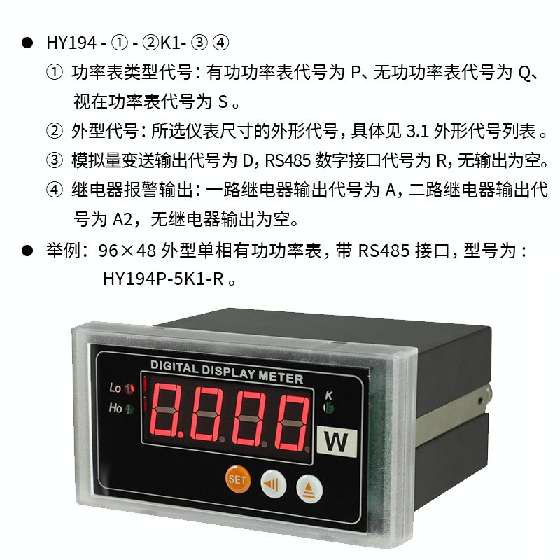 舉例:96×48外型單相有功功率表,帶RS485接口,型號為:HY194P-5K1-R。
