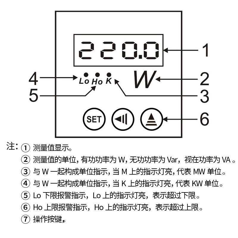 ④、與W一起構成單位指示,當K上的指示燈亮,代表KW單位。