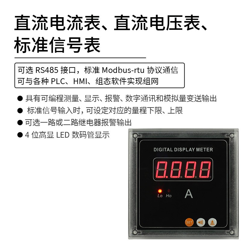 HY195系列數顯直流電流表、直流電壓表、標準信號表,是一種具有可編程測量、顯示、報警、數字通訊和模擬量變送輸出等功能的智能儀表,廣泛應用于配電自動化、智能建筑、自動化生產線、測試臺等。真有效值測量,精度高,穩定性好。標準信號輸入時,對應的量程下限,上限可根據需要自由設定。